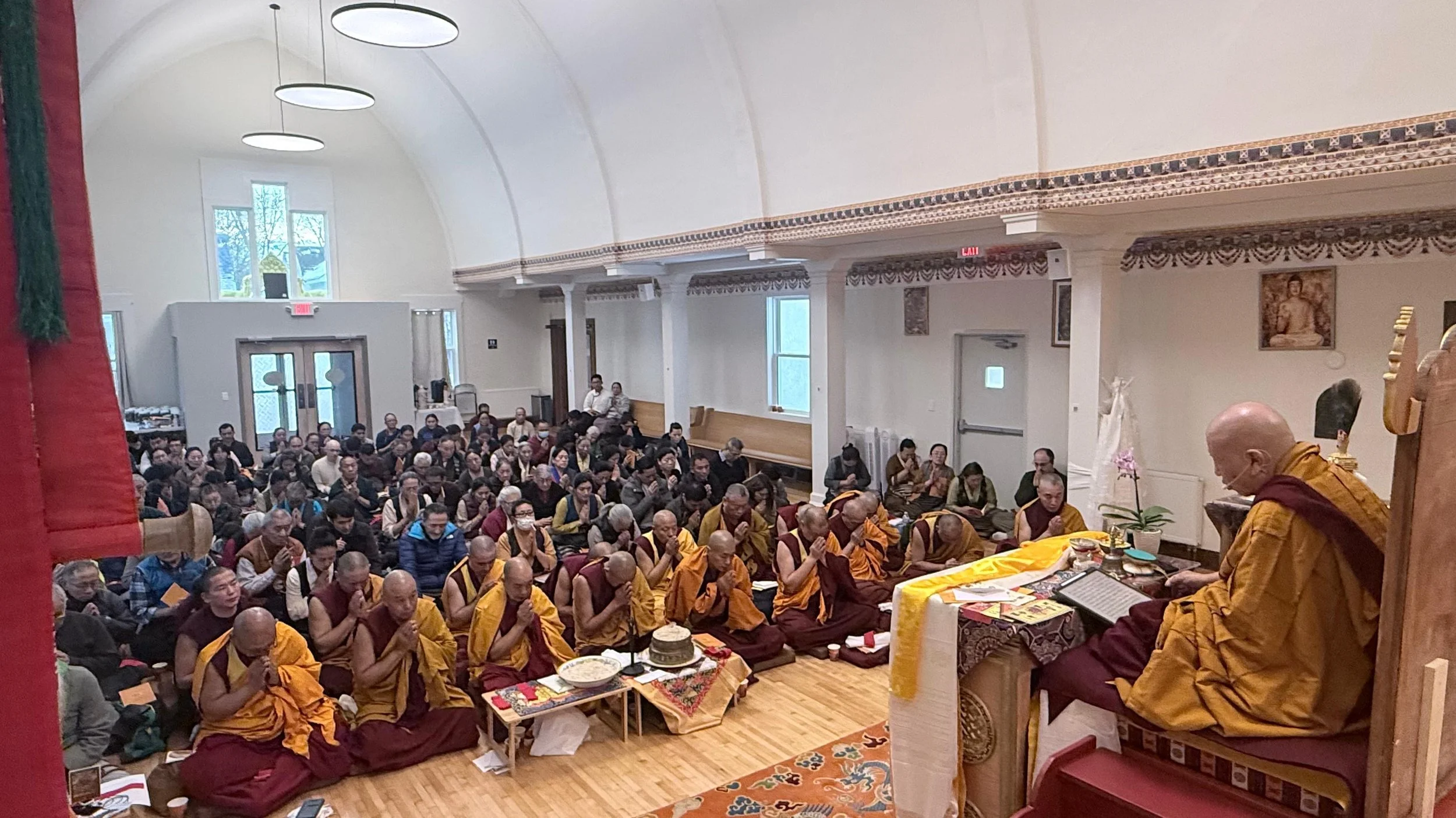 DMOD’s Opening Day began with an assembly of 15 Sangha reciting prayers at the Gompa’s main door as per tradition. Devotees, well wishers and neighbours lined the street below to witness this inaugural ritual. This was followed by the Consecration Puja in the Gompa before the main Buddha altar that was adorned with a vast array of offerings. The floors of the Gompa reverberated with the deep chanting tones of the monks, accompanied by the devotees which had grown to more than 150 people. Upon the conclusion of the Puja, offerings were made to HH Dalai Lama’s throne and the Sangha. Drupa Rinpoche, founder of DMOD then gave a welcome-cum-thanksgiving speech in Tibetan and in English. Everyone was invited to offer khata (white scarf) to His Holiness’ throne. The morning’s event culminated in an extensive buffet of Tibetan and Asian dishes, to the delight of all who attended. May the Buddhadharma flourish for the benefit of all living beings!