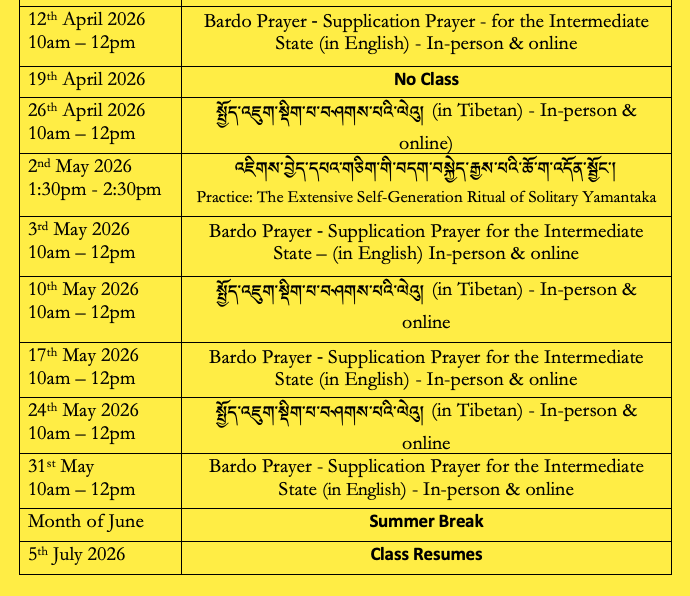 Ancient wisdom yet relevant to contemporary life, Shantideva’s verses challenge our outlook and responses to everyday life situations through reasoning and logic. The text extols the value of developing bodhicitta (altruism) through cultivating mindfulness, introspection and engaging in the 6 Perfections of generosity, morality, patience, joyful effort, concentration and wisdom. This semester discusses the Perfection of Concentration. In the Tibetan language Dharma classes, the text that is being discussed is Six Preparatory Practices and second chapter of Bodhicaryavatara. The combined (Eng/Tibetan) class schedule is set out below.