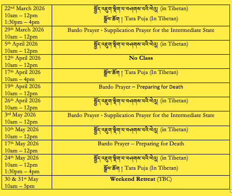 Ancient wisdom yet relevant to contemporary life, Shantideva’s verses challenge our outlook and responses to everyday life situations through reasoning and logic. The text extols the value of developing bodhicitta (altruism) through cultivating mindfulness, introspection and engaging in the 6 Perfections of generosity, morality, patience, joyful effort, concentration and wisdom. This semester discusses the Perfection of Concentration. In the Tibetan language Dharma classes, the text that is being discussed is Six Preparatory Practices and second chapter of Bodhicaryavatara. The combined (Eng/Tibetan) class schedule is set out below.